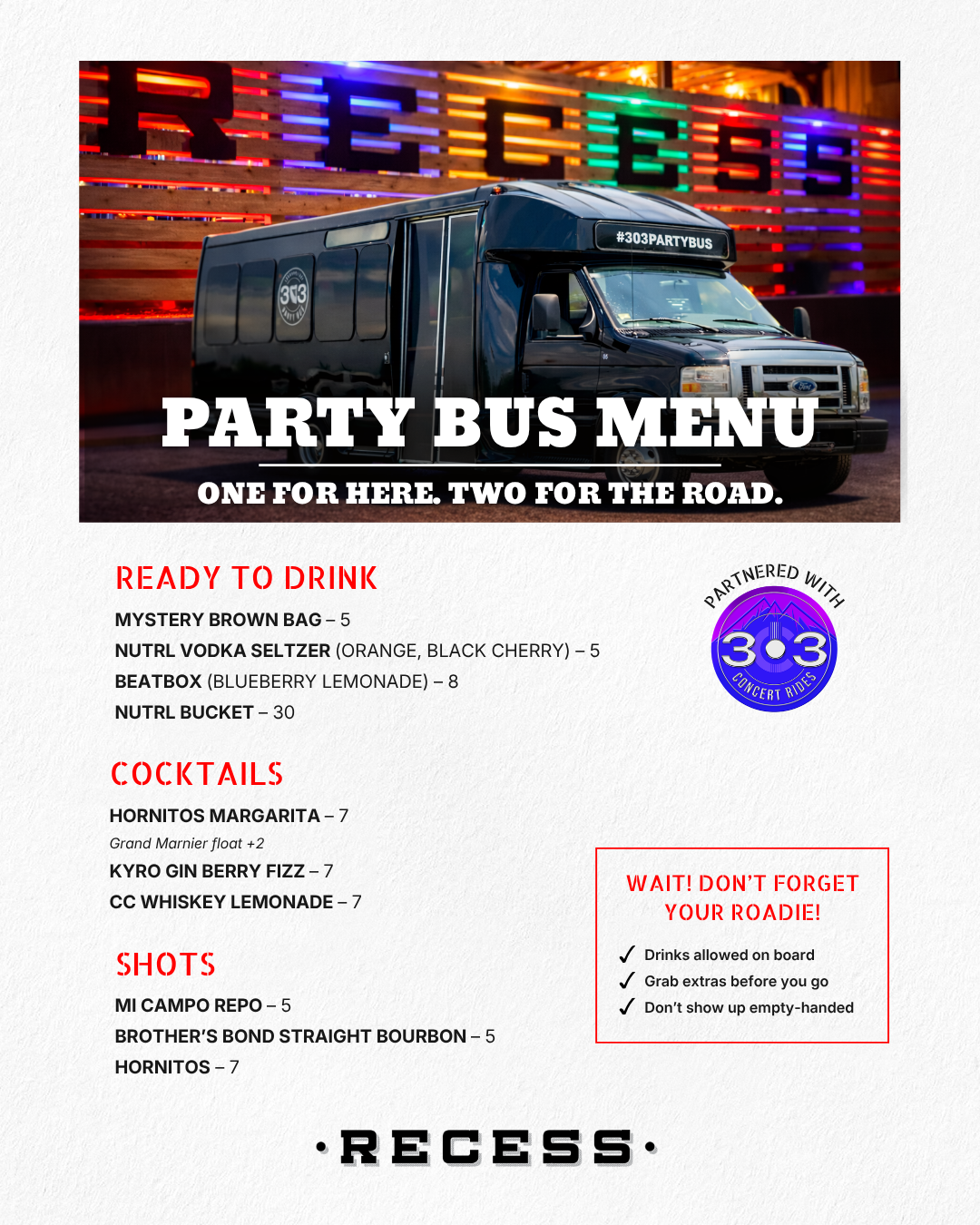 Concert Rides Recess + 303 Concert Rides Concert Rides From Recess Skip the chaos. Start the party. Ride to Red Rocks, Fiddler’s Green & more with pickup + drop-off at Recess (and drinks in hand!). What to expect: Round-trip rides to Red Rocks, Fiddler’s Green & other venues Pickup + drop-off at Recess Drinks allowed on the bus (yes, really) Rider-only drink specials before & after Easy option for groups–stay together all night Pro tip:Don’t just hop on the bus! Pull up early, grab a drink at Recess, and take one with you for the ride. View Party Bus Menu View Upcoming Shows Book Your Ride